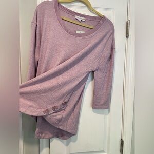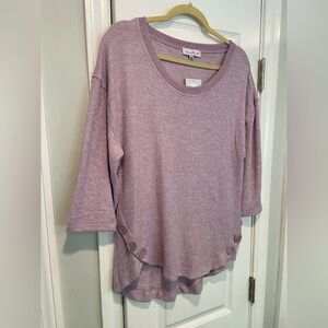 Soft crew neck pullover knit lavender purple 3/4 sleeve rounded hem with button detail tunic sweater
