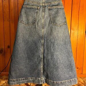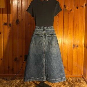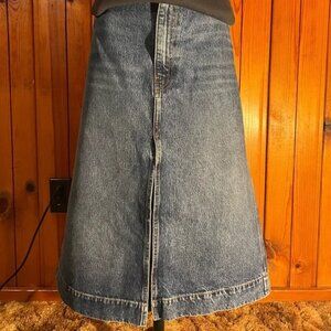 Brand new Khaite Charlene Skirt in Trinity, size 29, A-line silhouette, designed to sit low on hips, runs large and fits more like a 30-31 (but I still liked oversized fit), side and back patch pockets, denim (100% cotton), 34 5/8” Waist, 42 3/4” Hip, 29” Length