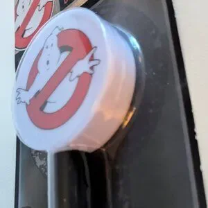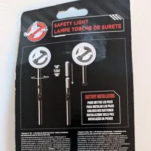 A cool and spooky light up Ghostbusters film logo safety light with classic ghost with circle slash image. This collectible trick or treating item measures approx 10" tall, takes 2 AA batteries (not included), has an on on/off switch and is new in package, the cardboard at the bottom of the package is bent. A scary but fun costume accessory for trick or treaters for Halloween!
