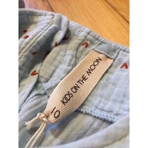 Size 10. Gauzy light blue with red hearts. Flutter sleeves. Back button closure. Measures 35” from shoulder to bottom. 100% cotton.