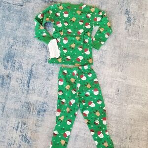 Adorable green pajama set from Sara's Print, has Santa, elves, reindeer, and snowflakes throughout.