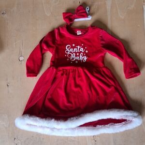 Adorable red dress with 'Santa Baby' print. Includes matching headband. Perfect for festive occasions.