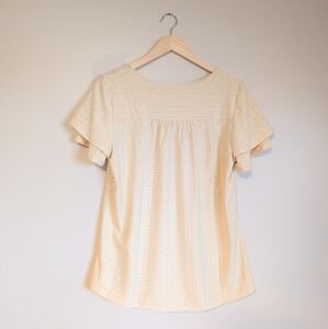 Beautiful tailoring and eyelet design. Flutter sleeves in a light creamy cotton fabric. Never worn. Perfect for spring.
