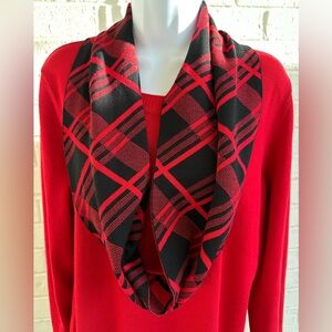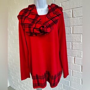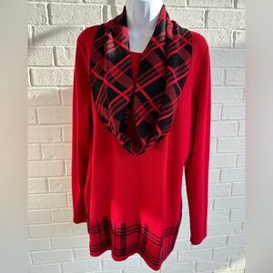 NWT Kim Rogers Red Pullover Tunic Sweater Plaid Hem, Plaid Infinity Scarf Size L