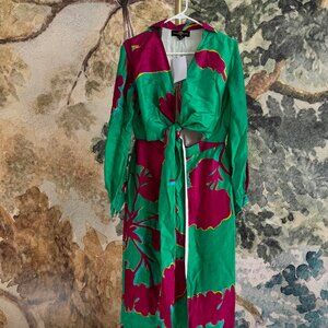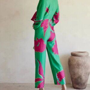 The Eden's sophisticated jumpsuit design features a bonsai print set in rich hues of green and fuchsia. A front tie and waist cutout provides subtle definition.