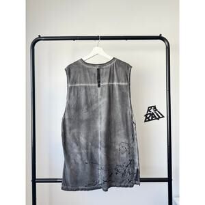 Avant-garde KmRii sleeveless top featuring an elongated silhouette, raw edges, asymmetric cut, and hand-applied paint splatter detailing. Lightweight yet premium Japanese-inspired construction designed for experimental, dark aesthetics.