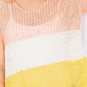 Beautiful knitted top with a fun twist detail in back! Orange, cream, mustard stripe. Makes a great swimsuit coverup top or can be worn with a cami underneath. Perfect for spring and summer! Pair with your favorite jeans. Made in USA. 75% polyester, 22% rayon, 3% spandex.