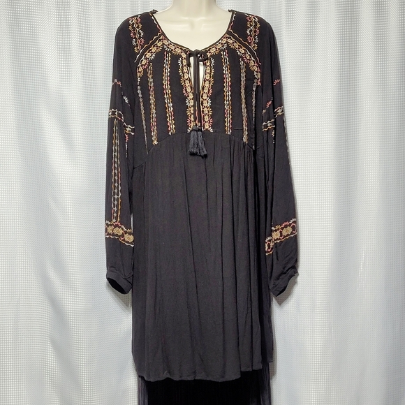 NWT Knox Rose Black & Embroidered Tasseled Flowy Long Sleeve Top Women's L