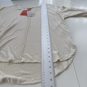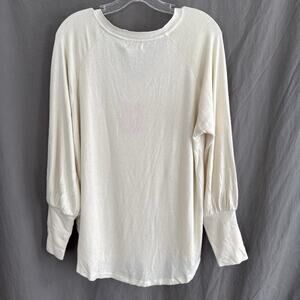 Soft, cozy knit top in a creamy neutral tone with a relaxed drape and subtly textured finish. Features a flattering V-neckline, curved high-low hem, and long gathered sleeves with wide cuffs. Easy to style for everyday wear — perfect on its own or layered for that effortless, elevated look. New with original tags; Knox Rose is now discontinued.