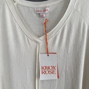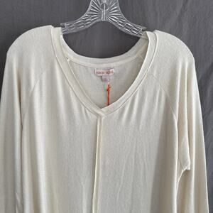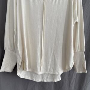 Soft, cozy knit top in a creamy neutral tone with a relaxed drape and subtly textured finish. Features a flattering V-neckline, curved high-low hem, and long gathered sleeves with wide cuffs. Easy to style for everyday wear — perfect on its own or layered for that effortless, elevated look. New with original tags; Knox Rose is now discontinued.