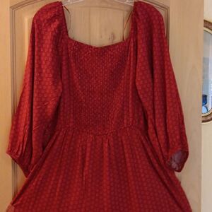 NWT. Liberty red, tiny flowers on a red background. Sweetheart neckline with elastic shirring for perfect fit. Medium length sleeves. Pleats under waist Size L measures 42 at chest. 36-42 at waist. 52 at hips, pockets here. 15-inch rise, 23-inch rise, 30-inch leg opening. The perfect topper will be one of my denim jackets. This is a beauty. and NEW.