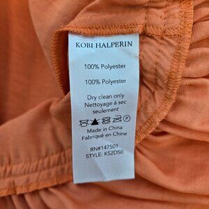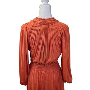 Adorable heavier weight but silky fabric dress that hits at right about the knee. Long sleeves with elastic at the wrists, pleated bodice design, smocked waist and tiered hemline. Double tie at the neckline creating a keyhole effect. This also has side pockets. Color is Tangerine