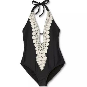 NWT Kona Sol Plunge Embroidered One apiece Swimsuit Black