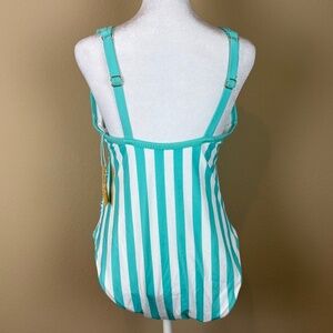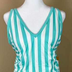 NWT Kona Sol Turquoise/White Striped V-Neck Over the Shoulder High Leg One Piece Swimsuit/Bathing Suit with Adjustable Straps, Side Ruching, Built In Chest Padding; Undergarment strip still intact; Sizes 14W and 18W available; Fabric and Care instructions shown in pictures