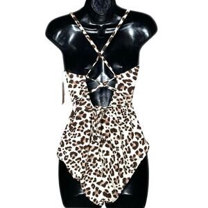 Kona Sol Leopard print one piece size medium. Medium coverage design with crisscross back and tie closure. Removable cups at the bust. Cream colored background with brown leopard print. Brand new with tags! Measurements: length (top of shoulder strap to crotch)- 28 inches and Chest (underarm to underarm)- 15 inches.
