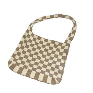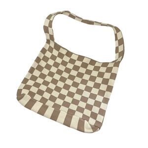 The KOPARI Limited Edition Checkered Knit Tote is a stylish and unique accessory featuring a tan and cream checkered pattern with a knit texture. It has a single strap and a rectangular shape, making it both fashionable and functional. A small gold-colored label with the brand name "KOPARI" is attached to the front, adding a subtle branded touch.