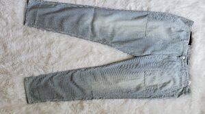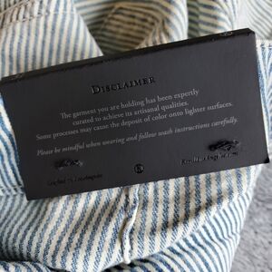 Nice lightweight super soft denim with light blue pinstripes. These are brand new with the waist tag still on but no hang tag.