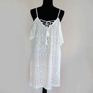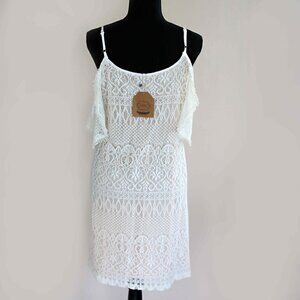 Kori America boho dress in cold-shoulder lace/crochet look. The dress has a peachy nude-toned liner.