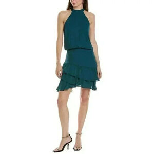 NWT Krisa Halter Asymmetrical Ruffle Mini Dress Teal Green Size Small holiday party work wedding shower lined button neck closure