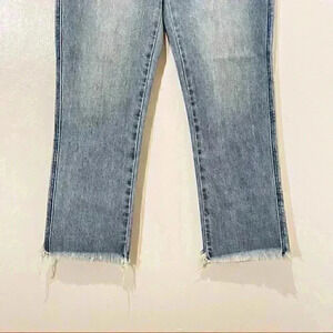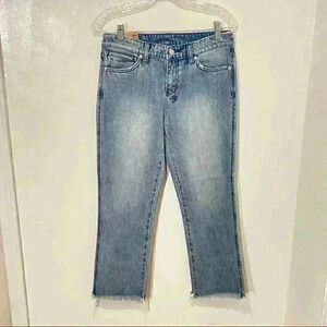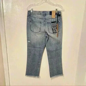 Description: Raw hem; light distressing; zip and button fly; five pocket construction.