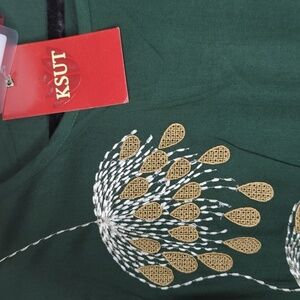 The NWT KSUT emerald green kurta with embroidered floral accents in women's size XL is a stylish and traditional piece of clothing from India. Made from cotton, this kurta embodies the essence of Indian culture and craftsmanship. The intricate embroidery and vibrant green color make it a standout piece for any wardrobe, perfect for those looking for a blend of elegance and comfort in their clothing choices.
