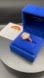 Heart-shaped ring with multicolor gemstone. Presented in a blue box.