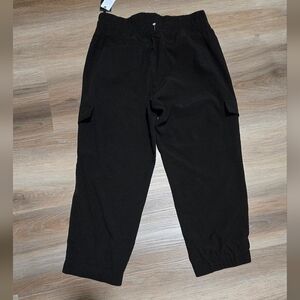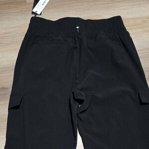 New With Tags, Black, Pull on, Elastic drawstring waist, Zip front pockets, Back and cargo pockets, Elastic hem, Cropped, Stylish black cargo pants with multiple pockets. Perfect for casual activewear. Kyodan Black Cargo Nylon Active Athleisure Lightweight Casual, Pants S. Please see measurements.