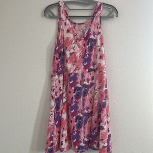 Tennis dress is very stretchy and comfortable. Pink, blue, purple, and white colors throughout. Comes with shorts that are solid white in color.