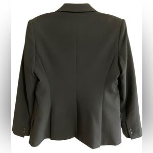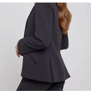 Expertly tailored single-breasted blazer in pure black. Strong shoulders, peaked lapels, angled flapped pockets, and a contoured hemline accentuate an hourglass shape. Cinched waist is highlighted by a single button closure Fully lined.