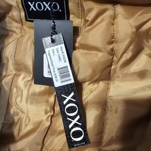 L Camel colored XOXO water resistant jacket NWT. Zippers are still covered to prevent scratches. Very soft faux fur lined hood with trim. Two zippered pockets. Jacket has both zipper and snap closures for ensured warmth. Drawstring to cinch waistline for attractive fit. 100% polyester, machine washable