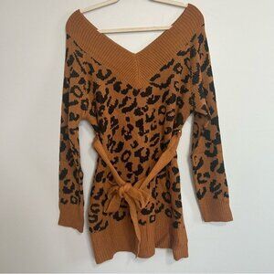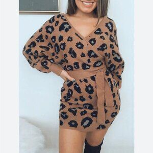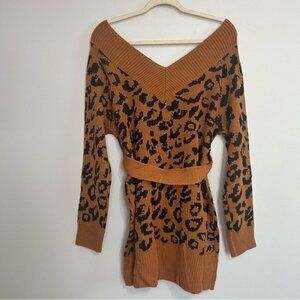 NWT L Love Brown Leopard Print Long SleeveMini Sweater Dress Women’s Size Small