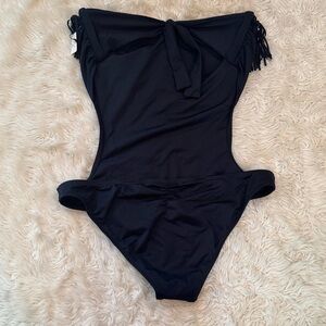 Fringe bandeau one-piece swimsuit. Ties at back.