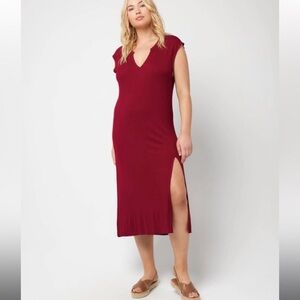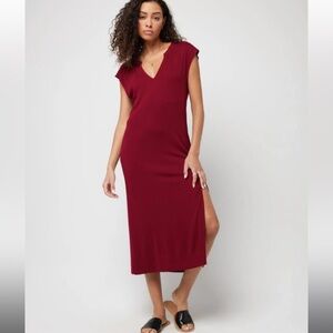 An effortless dress you can wear all day? Yes please! A midi dress with V-neckline and short drop sleeve, the Robyn Dress will have you feeling as easy as can be. A thigh-high slit adds a flirty finish to a weekend-ready ribbed T-shirt dress topped with a notched neck and cap sleeves.