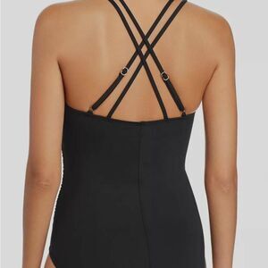 NWT LA Blanca Women's Black Island Ruched Cross-Back One-Piece Swimsuit