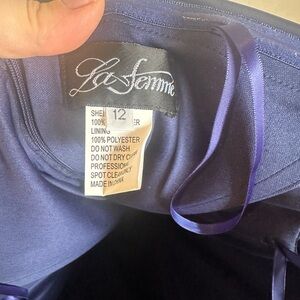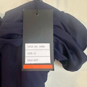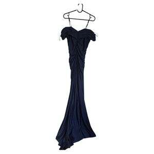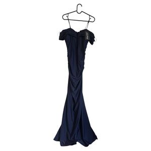Jersey off the shoulder gown with a chic design and V neckline. Ruching throughout gown for flattering fit.