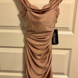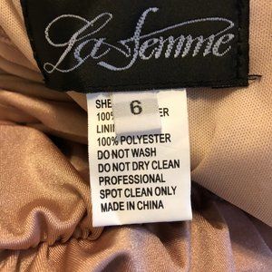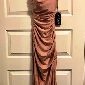 NWT LA FEMME Off the Shoulders Trumpet Gown Ruched Pink Satin Lace-up Back 6