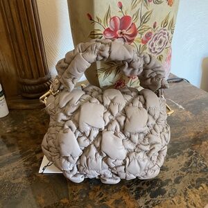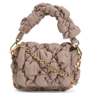 Puffy design, detachable chain crossbody strap, detachable top carry handle, gold tone hardware, contrast stitching