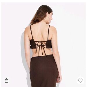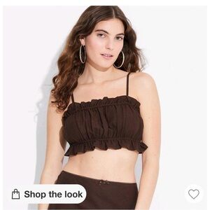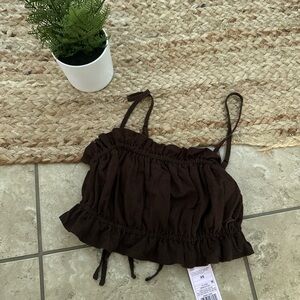 brown linen ruffle dainty tank with double tie back adjustable and has adjustable straps