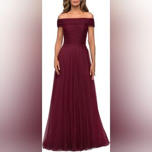 NWT LA Femme Embellished Off the Shoulder Mesh Gown