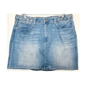 Curve-hugging denim mini skirt with a unique braided detail at the waist.