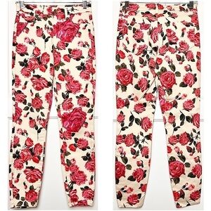 The label's signature Margot skinny jeans are screen-printed in L.A. with a blooming rose floral wash for a fresh take. 5-pocket design, single-button closure, clean lines, and a slim fitted silhouette throughout.