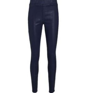 L'Agence Rochelle Coated Pull On Jean in Stargazer Blue, coated. High rise. Super skinny fit. Pull on jean Super stretch. Subtle sheen. Lightweight coating. Pull on style. 78% Modal, 14% Cotton, 6% Polyester, 2% Spandex