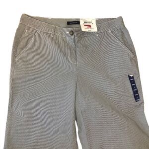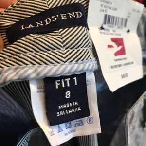 Women’s size 8 x 32 lands end fit one navy pinstripe pants. 100-% cotton. Lightweight and super flattering. Fit 1 lands end.