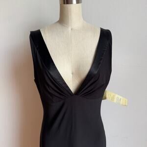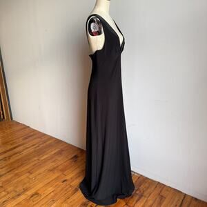 Details: LAUNDRY BY SHELLI SEGAL timeless black sleeveless maxi dress with deep-v neckline, silk charmeuse trim, empire waist, straps that narrow at the back and attach to the center of the back. Fully lined and stretchy. Elegant and sophisticated for a formal or black tie wedding or event with clean and classic lines. Feminine and a bit daring and sexy.