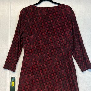 NWT LAUREN RALPH LAUREN Sheath Dress Size 14 Red Black Geometric Ruched Midi 3/4 Sleeve