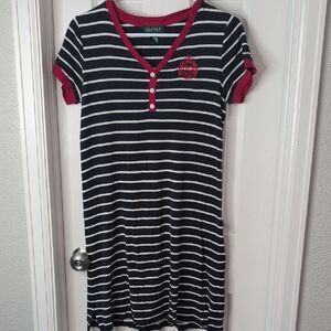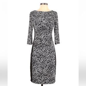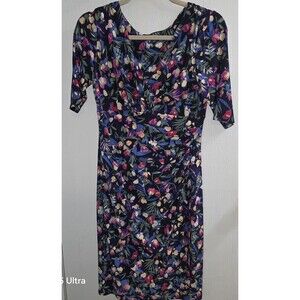 New With Tags! This flirty LRL sheath dress with flutter sleeves will impress. V-neck with overlap panel. Ruched waist on left side-body. Navy blue with ‘0’ designs. 95% polyester 5% elastane. Machine wash + dry.