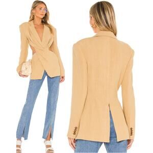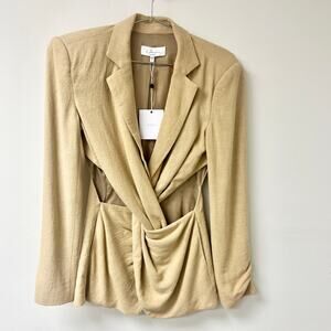 NWT L'Academie Emmy Twist Front Waist Cut-Out Padded Shoulder Blazer Tan Small