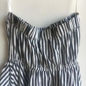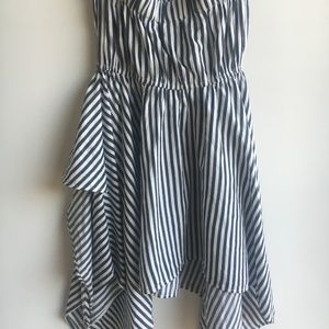 L'Academie x REVOLVE "Only Way Out" Strapless handkerchief hem dress, elasticized waist. Striped - dark gray / white. 100% cotton.