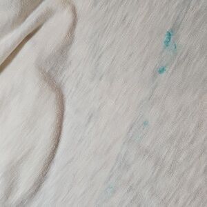 **Please see all photos. The tee has the teal color paint on the bottom right backside, shown in photos.**
