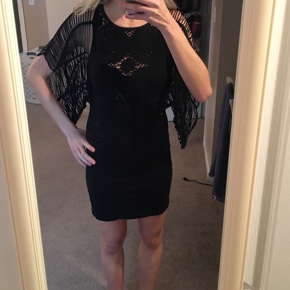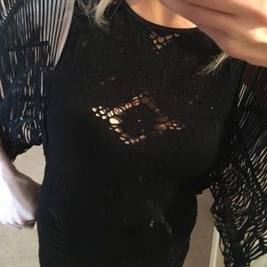 Black spandex , fringe arms, cutouts on chest and back. Super comfy! Never worn with tags!